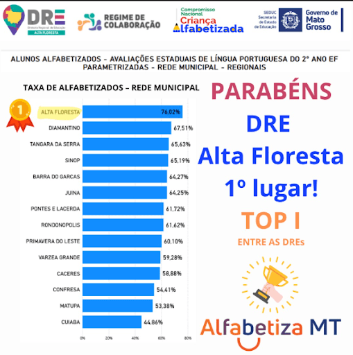 Para a Regional de Alta Floresta, a contemplação de alcançar o 1º lugar entre as regionais que compõem o estado de Mato Grosso, registrando 76,02% de crianças alfabetizadas em 2024. Destacamos que os sete municípios que compõem a regional de Alta Floresta, todos tiveram crescimentos consideráveis.