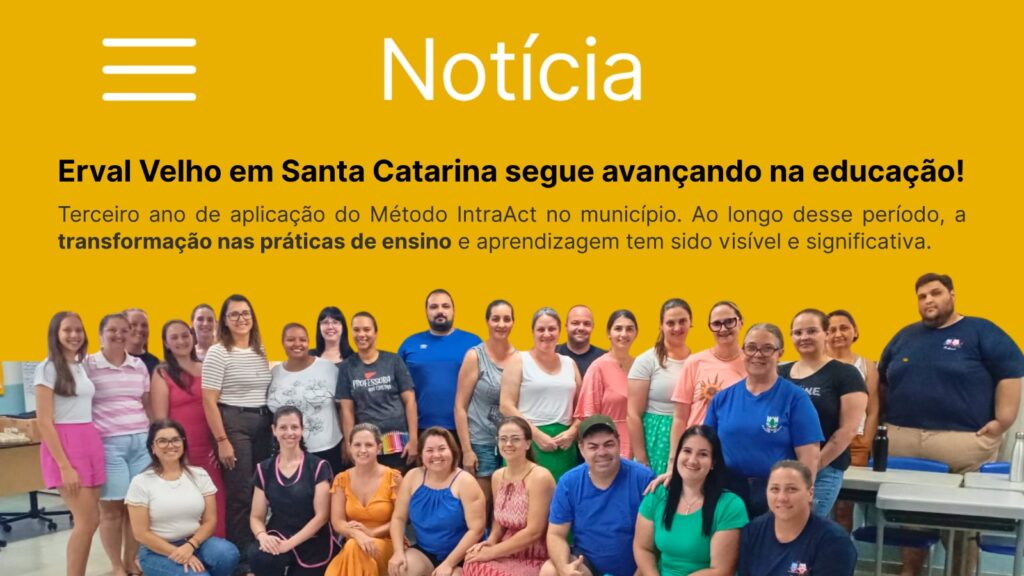 O município de Erval Velho celebra um marco importante na educação: o terceiro ano de aplicação do Método IntraAct, consolidado com o acompanhamento contínuo da assessoria pedagógica do método. Ao longo desse período, a transformação nas práticas de ensino e aprendizagem tem sido visível e significativa.