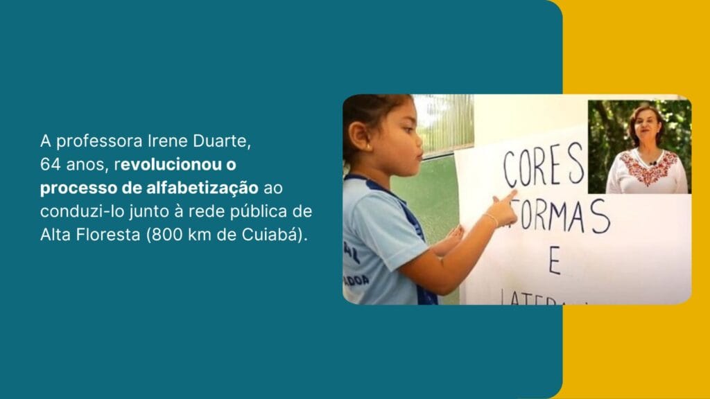 A professora Irene Duarte, 64 anos, revolucionou o processo de alfabetização ao conduzi-lo junto à rede pública de Alta Floresta (800 km de Cuiabá). O método de ensino IntraAct foi desenvolvido na Alemanha na década de 90 e está sendo aplicada desde 2021, no município.